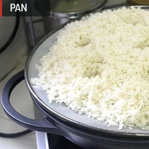 Rinse rice thoroughly to remove the starch. Soak the rice in equal quantity water for 60 min. Add an additional one-fifth cup of water for every cup of rice. With the lid on, cook on a low flame until it starts boiling. When it begins to boil, take off the lid and leave it on a high flame until the water evaporates from the surface (appx. 5 min.) Gently fluff the rice and serve.