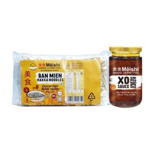 Meishi XO Sauce Combo With Meishi Ban Mien Handcut Hakka Broad-Size Noodles: “Meishi takes you on a journey through the Orient by bringing you authentic ingredients for use in your traditional recipes. Experience a new range of products with Meishi. This combo pack is most commonly used for Chinese dishes.